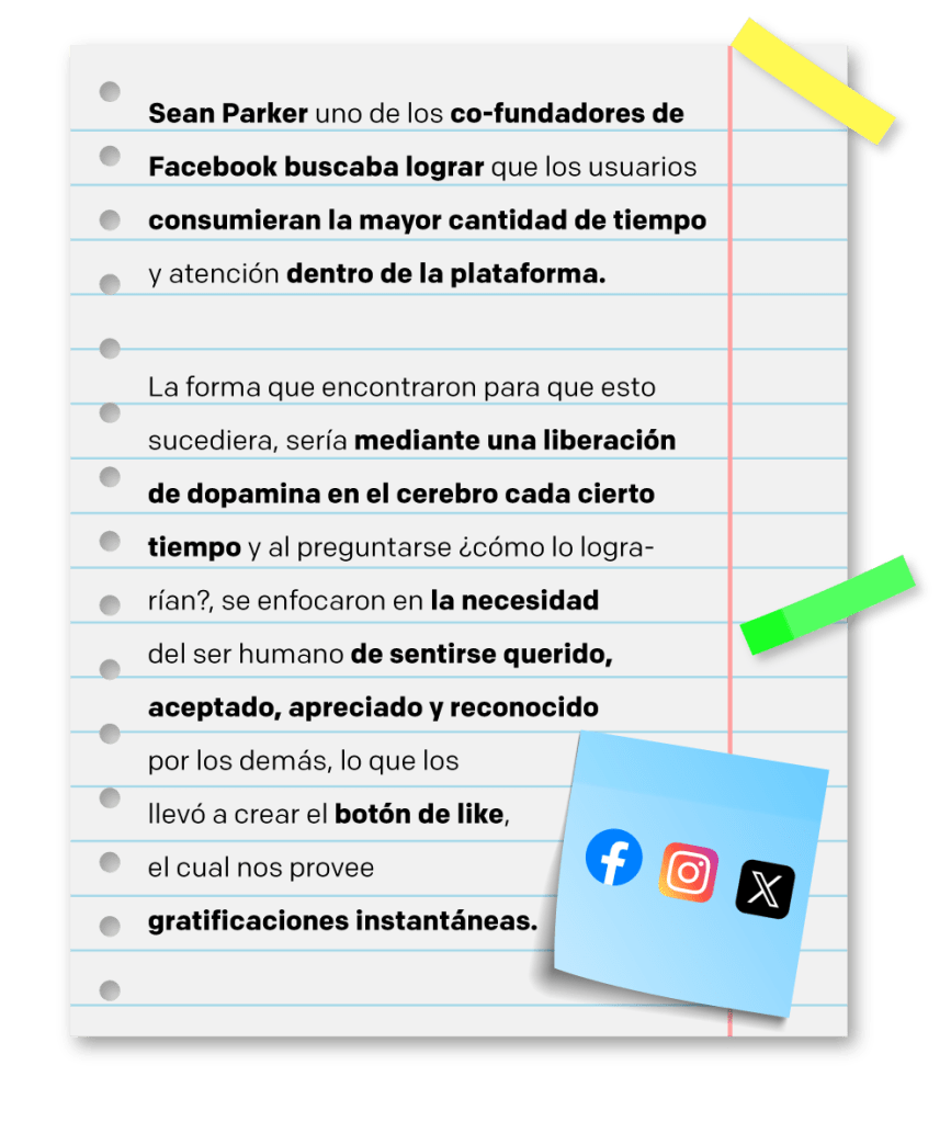 Las redes sociales están diseñadas para activar el sistema de recompensas del cerero, liberando dopamina cuando recibimos “Likes” y comentarios positivos. Esta sensación de validación social se convierte en un ciclo adictivo, ya que buscamos constantemente esta gratificación y nos sentimos mal cuando no la obtenemos.