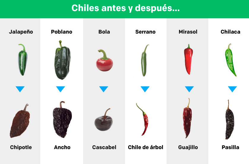 Algunos chiles pasan por una metamorfosis, pues antes y después de secarse, los chiles experimentan cambios significativos tanto en su color, textura, olor y sabor y por lo tanto cambian hasta de nombre.